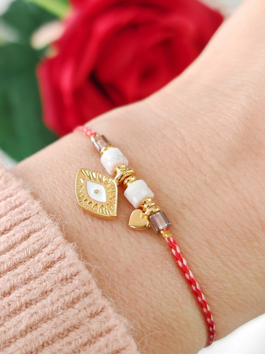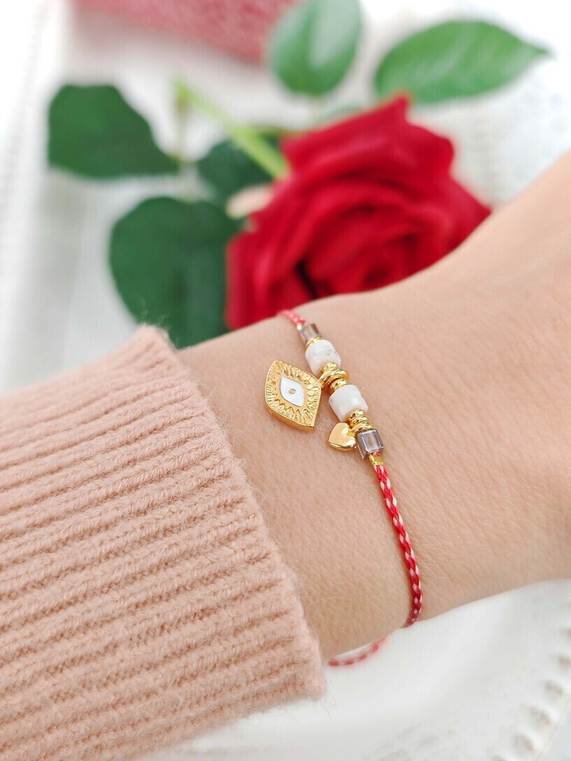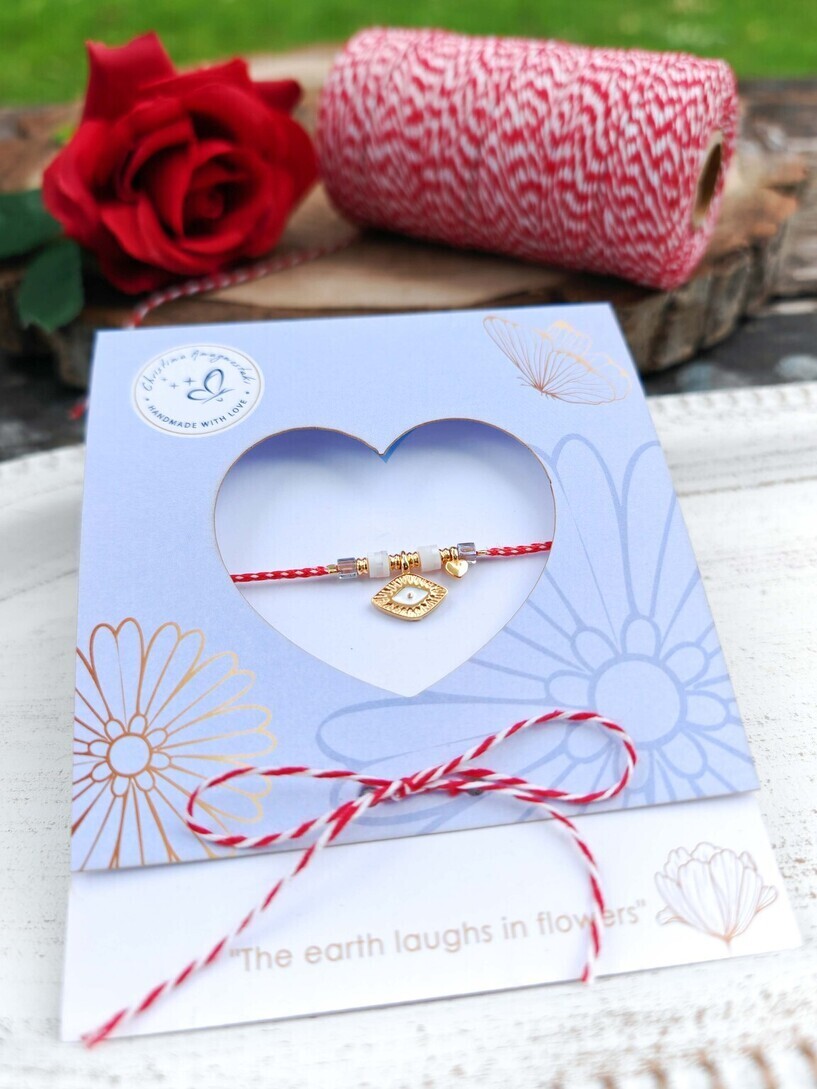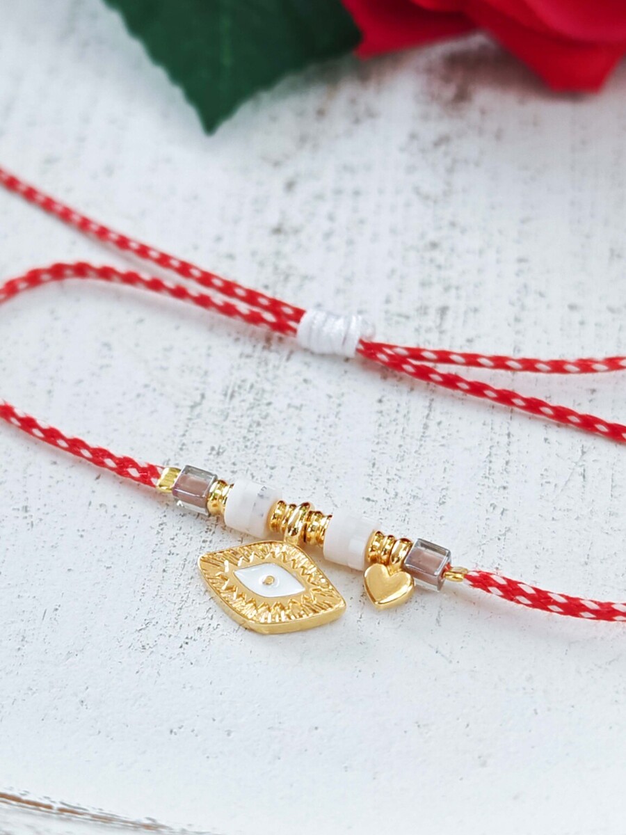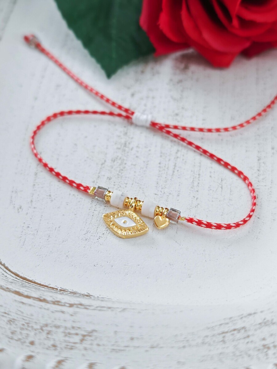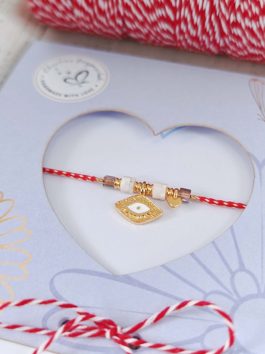 Μαρτάκι μάτι από ορείχαλκο επιχρυσωμένο με λευκό σμάλτο, καρδούλα και ροδέλες φίμο. Μίνιμαλ και κομψό.