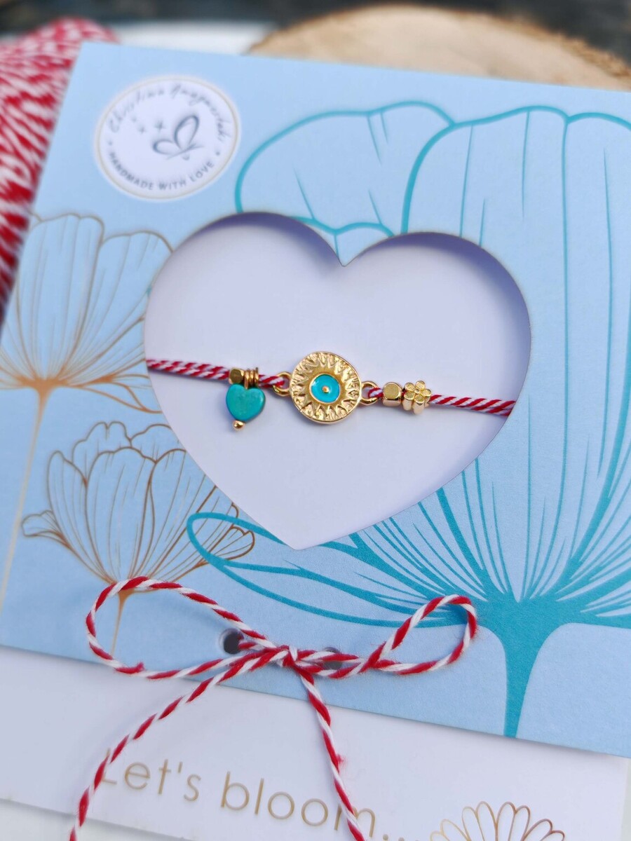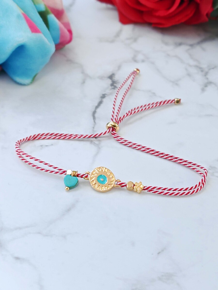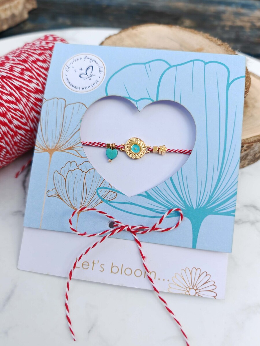 Μαρτάκι με κλείσιμο με χάντρα με σιλικόνη, στοιχεία από ορείχαλκο επιχρυσωμένο και καρδιά από χαολίτη.