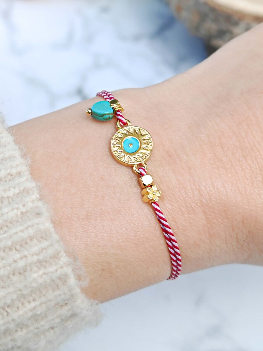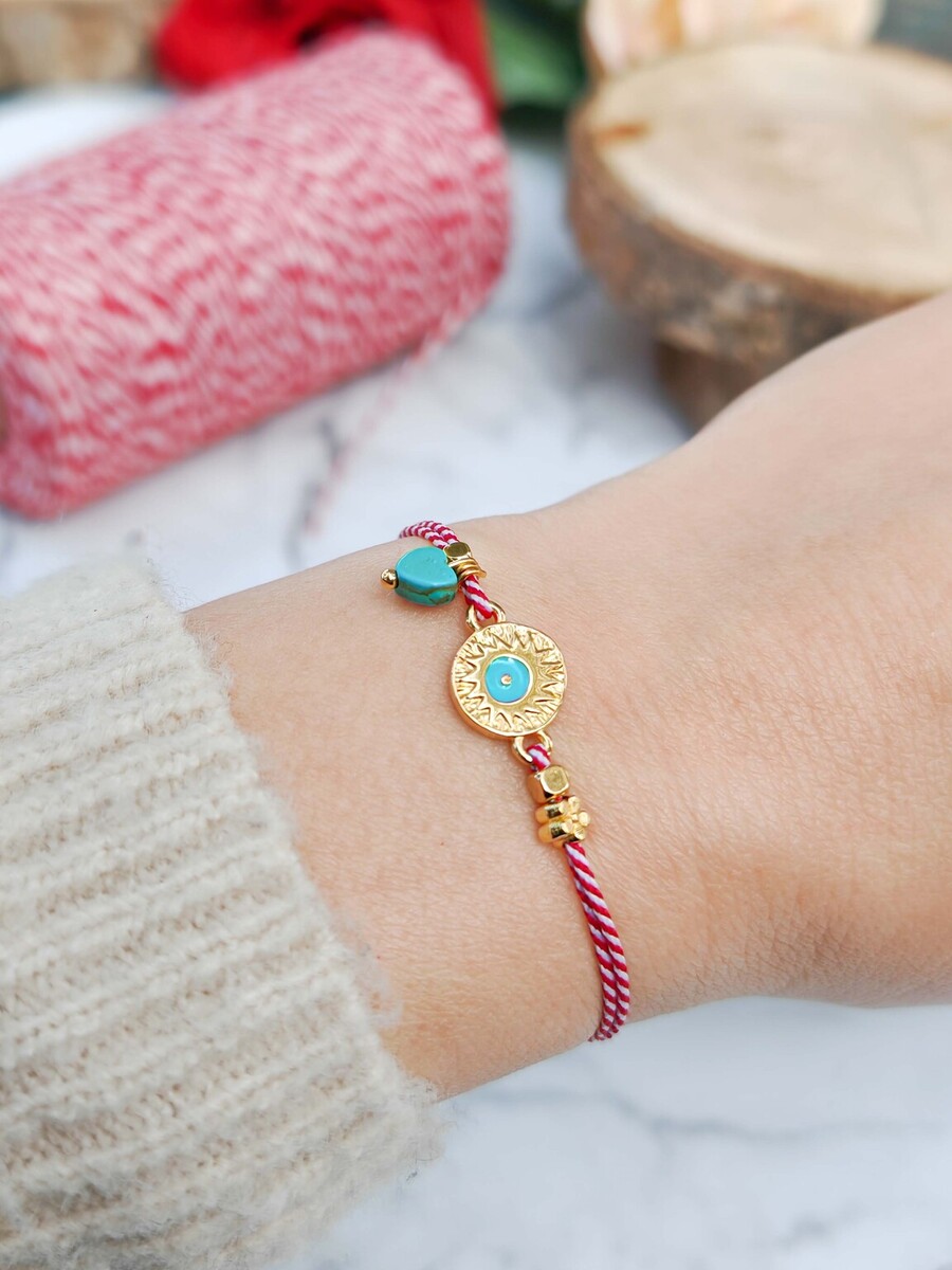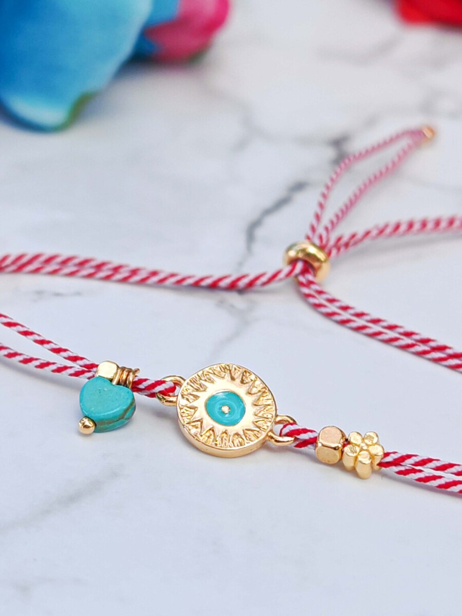 Μαρτάκι με κλείσιμο με χάντρα με σιλικόνη, στοιχεία από ορείχαλκο επιχρυσωμένο και καρδιά από χαολίτη.