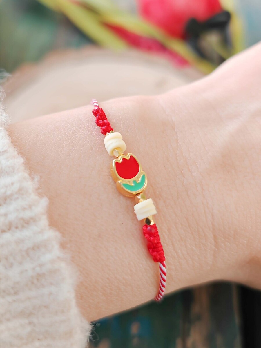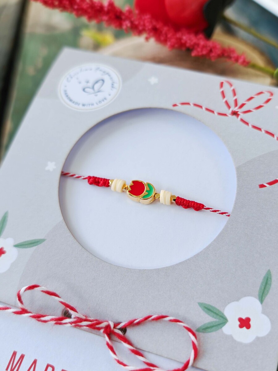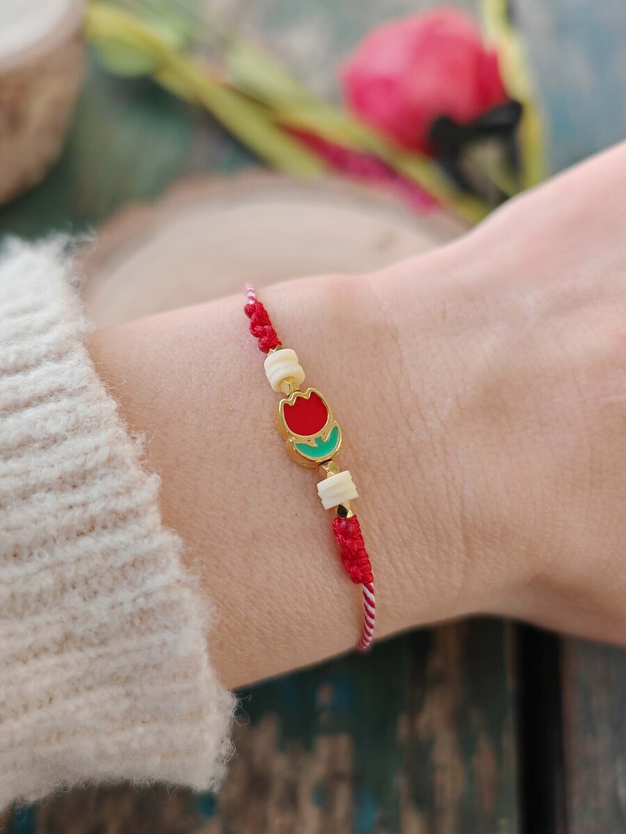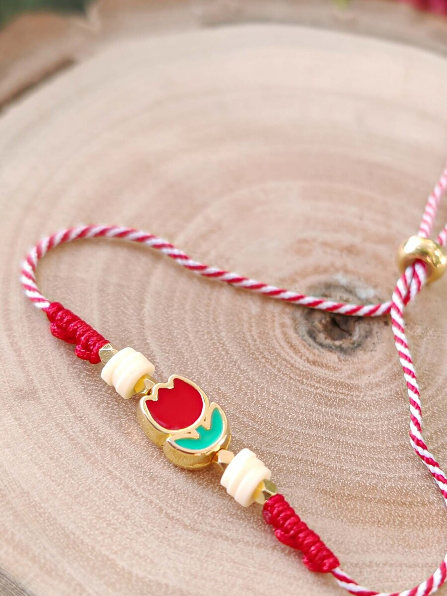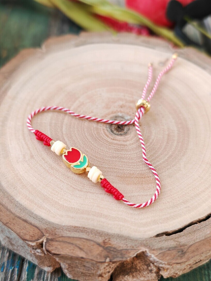 Μαρτάκι τουλίπα ζάμακ με σμάλτο και ροδέλες φίμο, με ιδιαίτερο κλείσιμο με χάντρα με σιλικόνη για αυξομείωση.