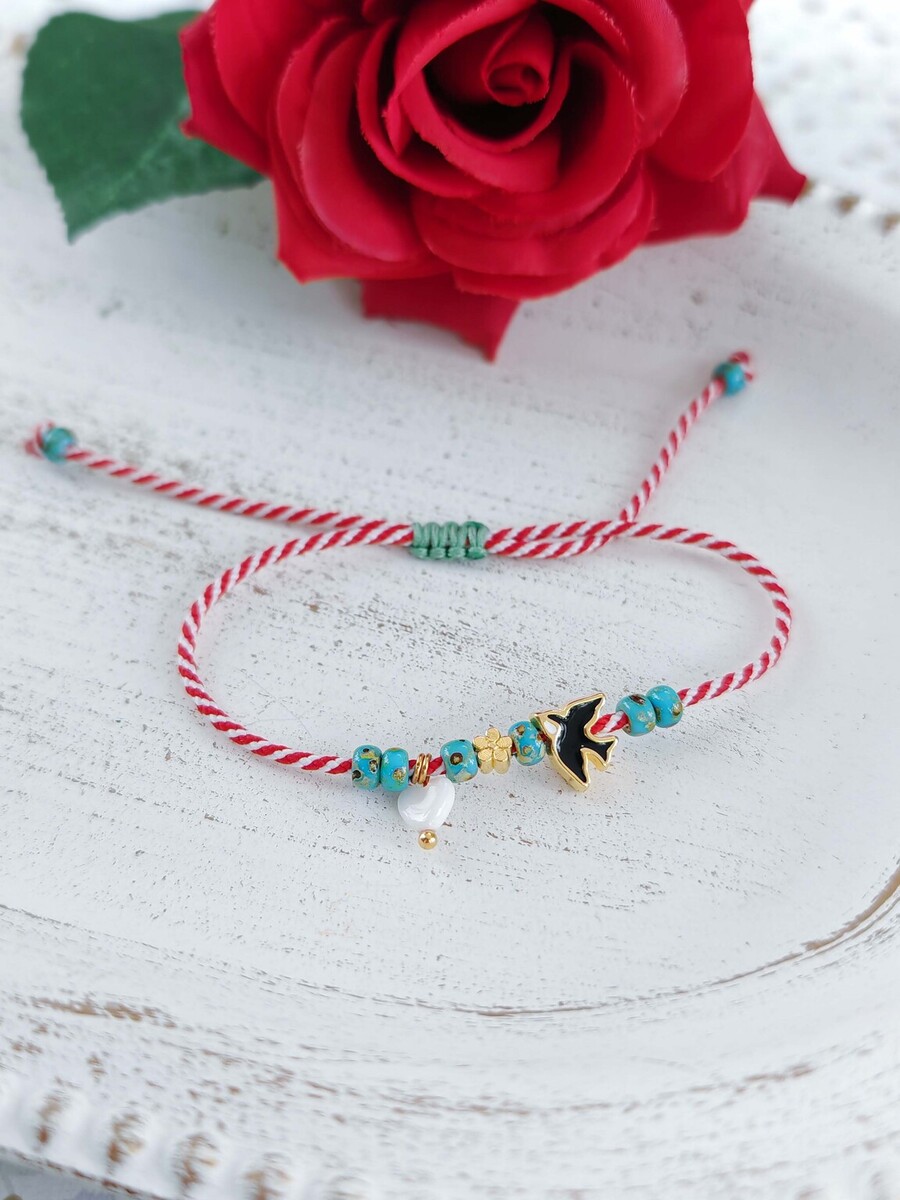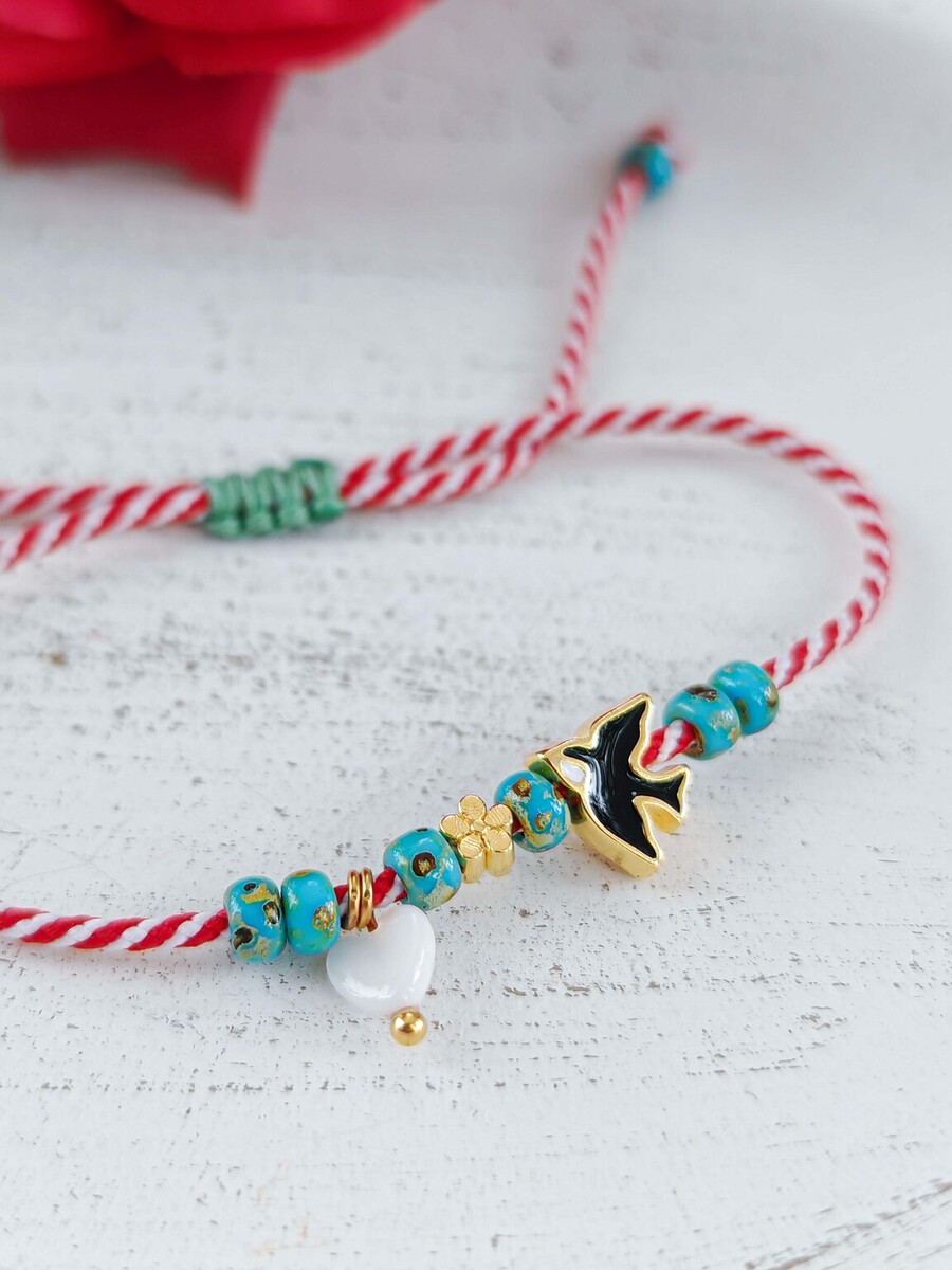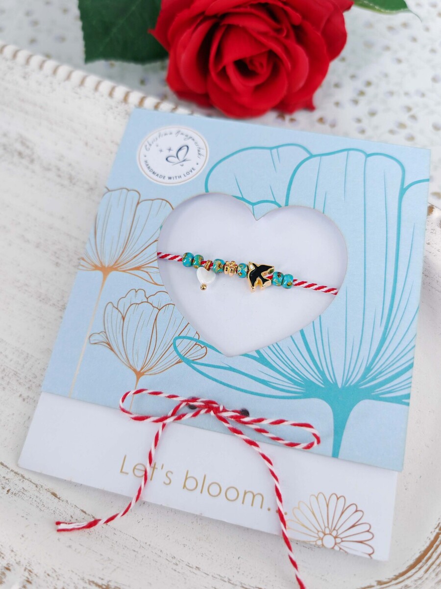Ένα μαρτάκι που σίγουρα φέρνει την Άνοιξη, με ροδέλες ακρυλικές σε τυρκουάζ χρώμα, καρδούλα λευκή Φίλντισι και χελιδόνι από ορείχαλκο επιχρυσωμένο με σμάλτο.