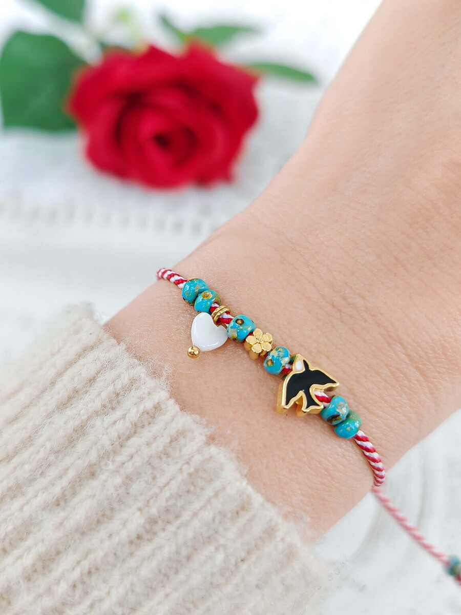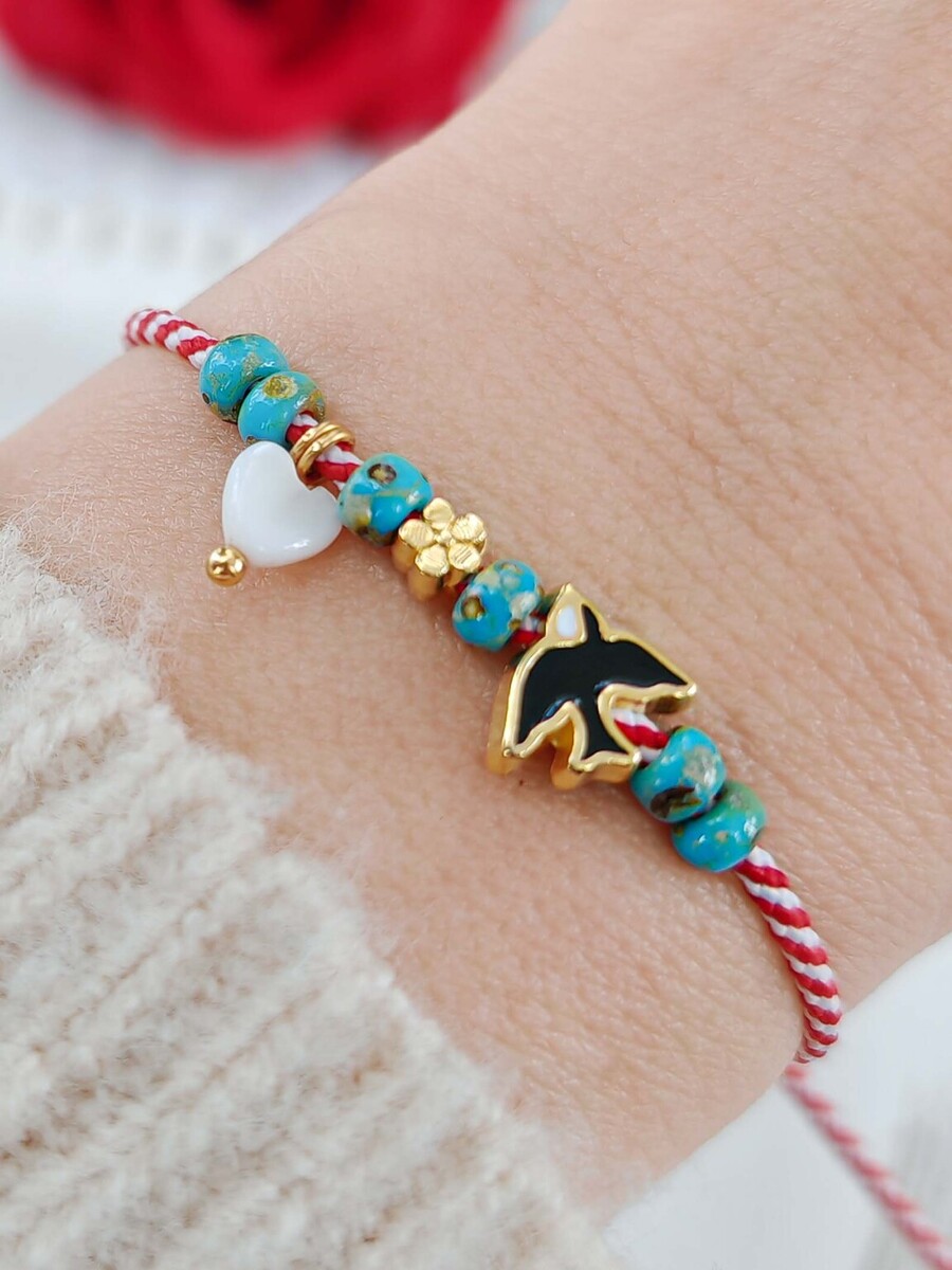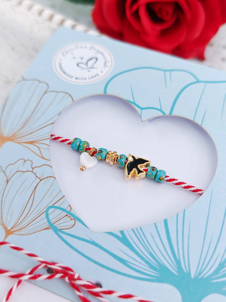 Ένα μαρτάκι που σίγουρα φέρνει την Άνοιξη, με ροδέλες ακρυλικές σε τυρκουάζ χρώμα, καρδούλα λευκή Φίλντισι και χελιδόνι από ορείχαλκο επιχρυσωμένο με σμάλτο.