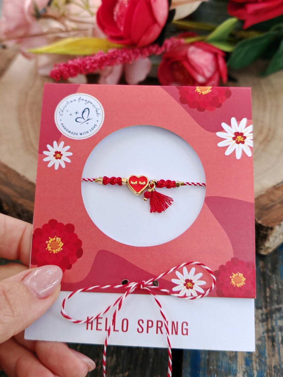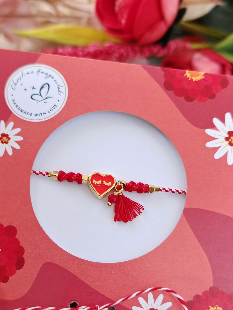 Μαρτάκι καρδούλα με ματάκια με κόκκινο σμάλτο και φουντάκι και κρυσταλλάκι.