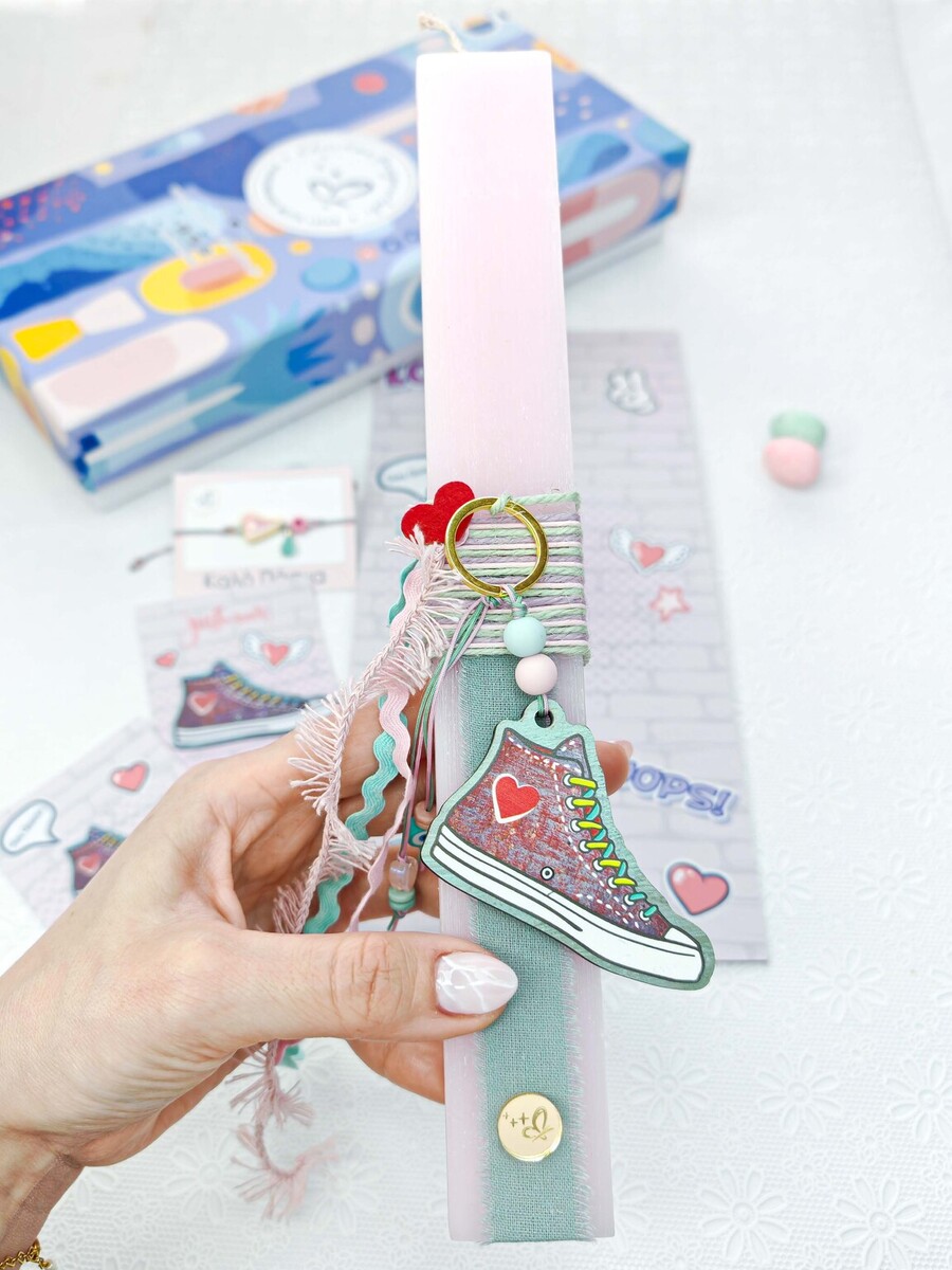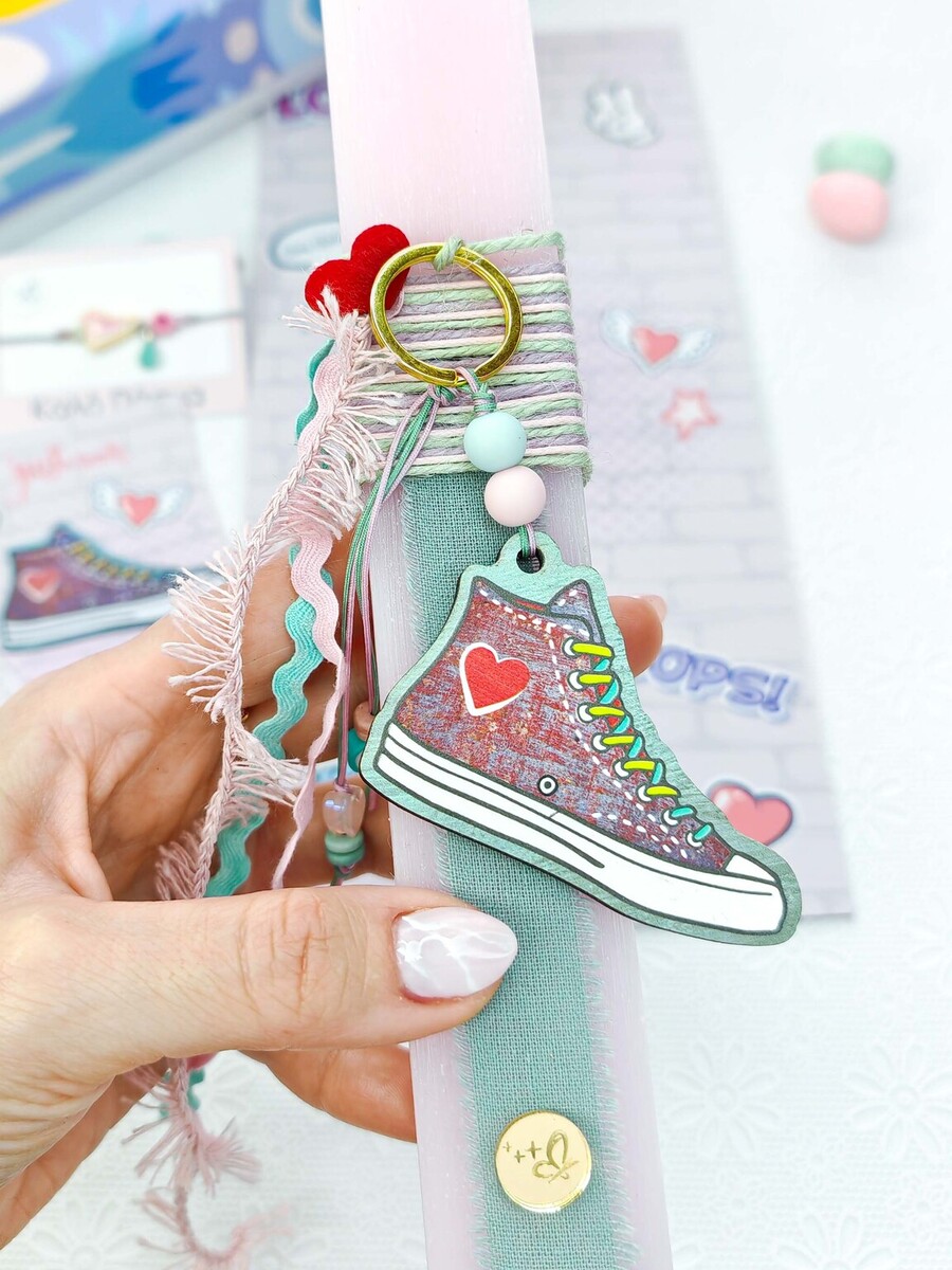 1. Λαμπάδα αρωματική 29 εκατοστά ύψος, με ξύλινο παπούτσι σταράκι μπρελόκ