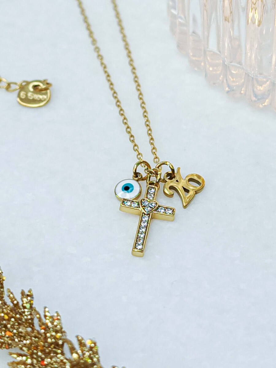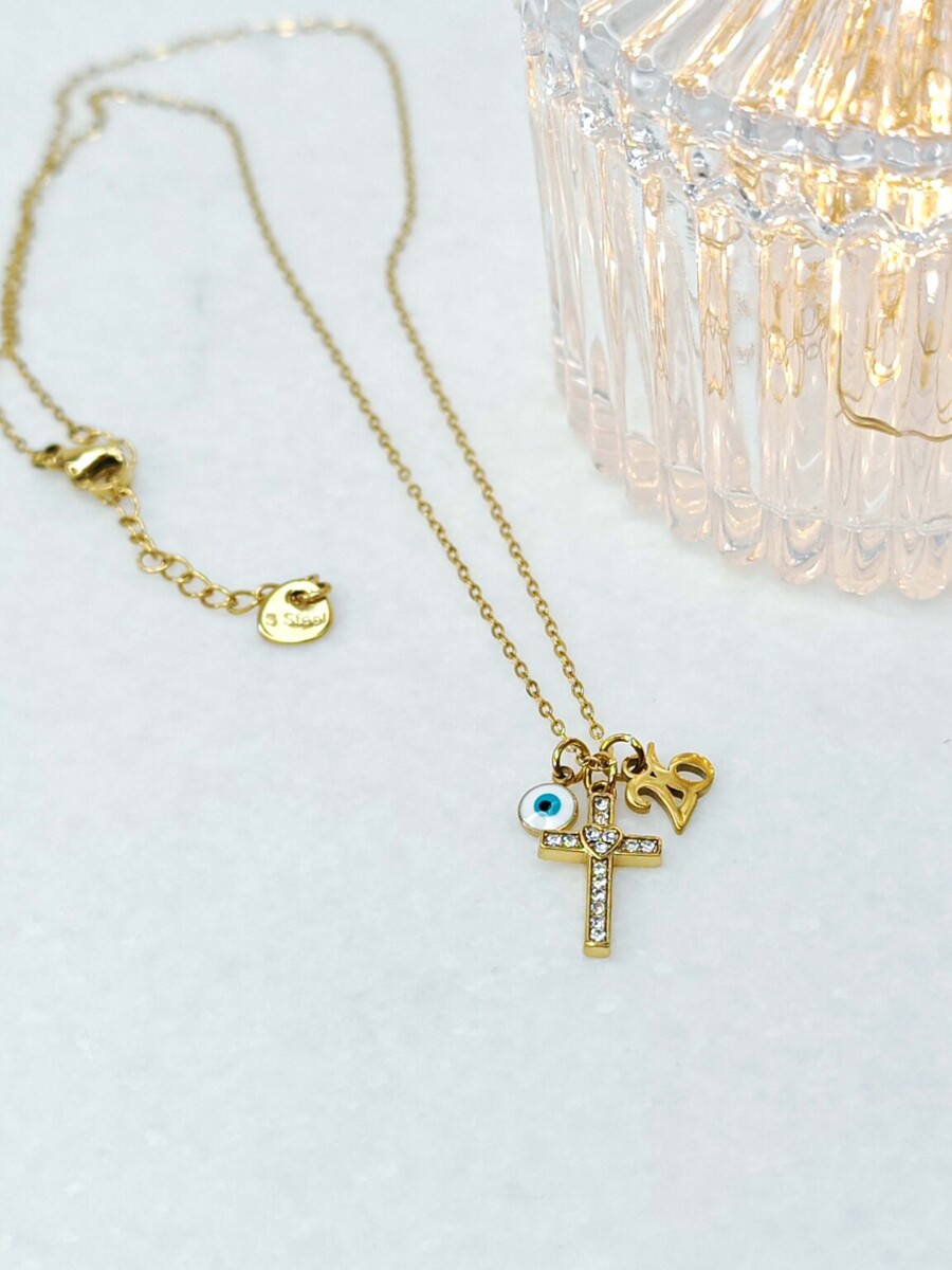 Ατσάλινο κολιέ 40 εκατοστά συν έξτρα επέκταση με σταυρουδάκι με ζιργκόν, ματάκι και 26.