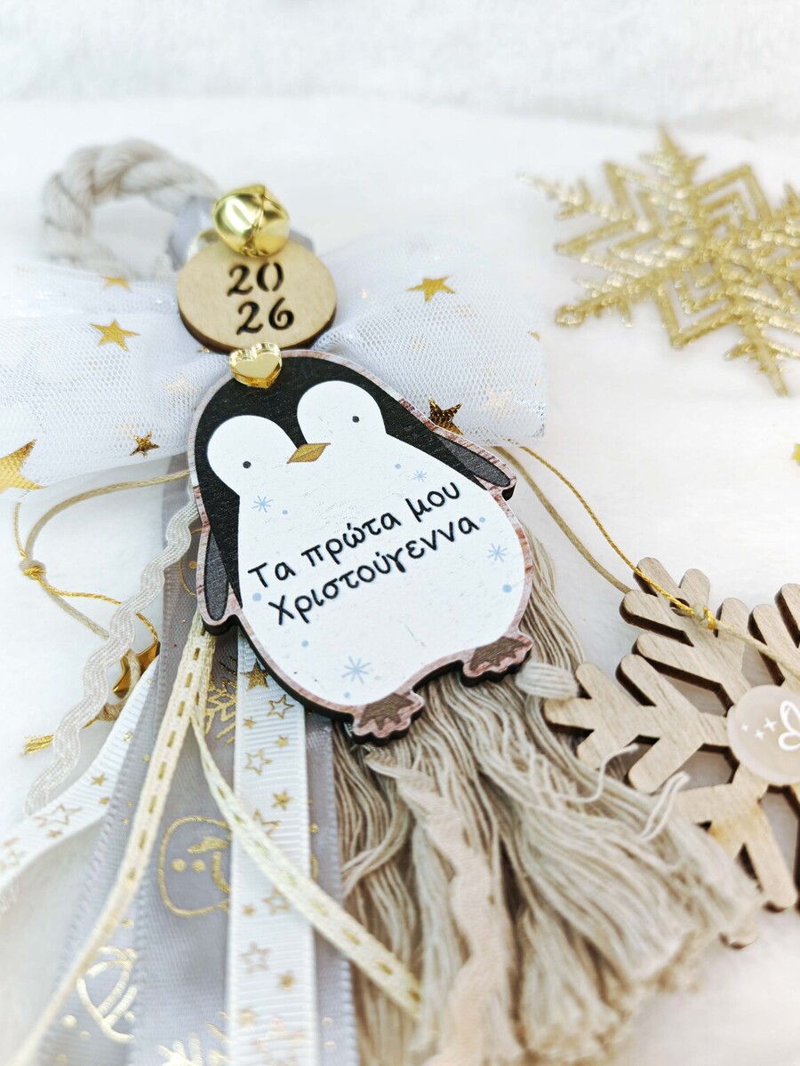 Ξύλινα στοιχεία σε ένα υπέροχο unisex παιδικό γούρι για τα πρώτα Χριστούγεννα του μωρού σας.