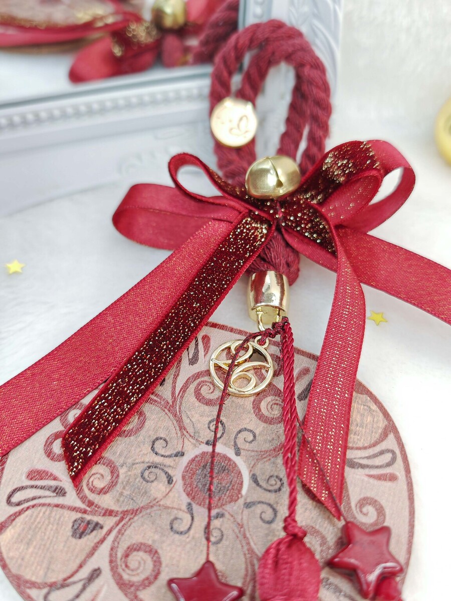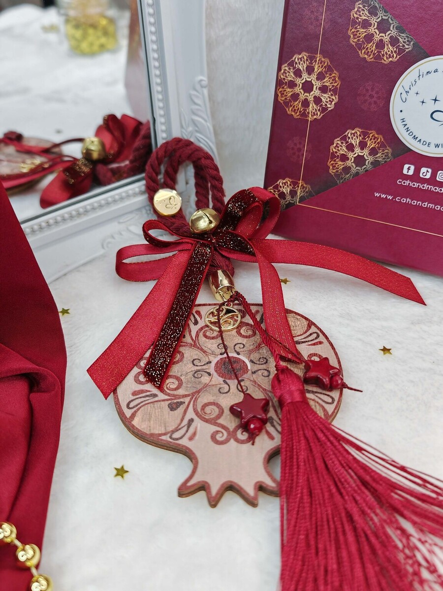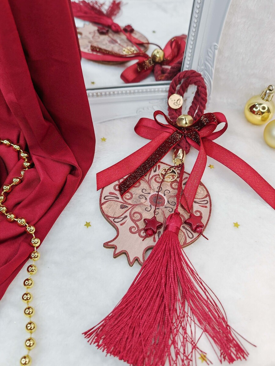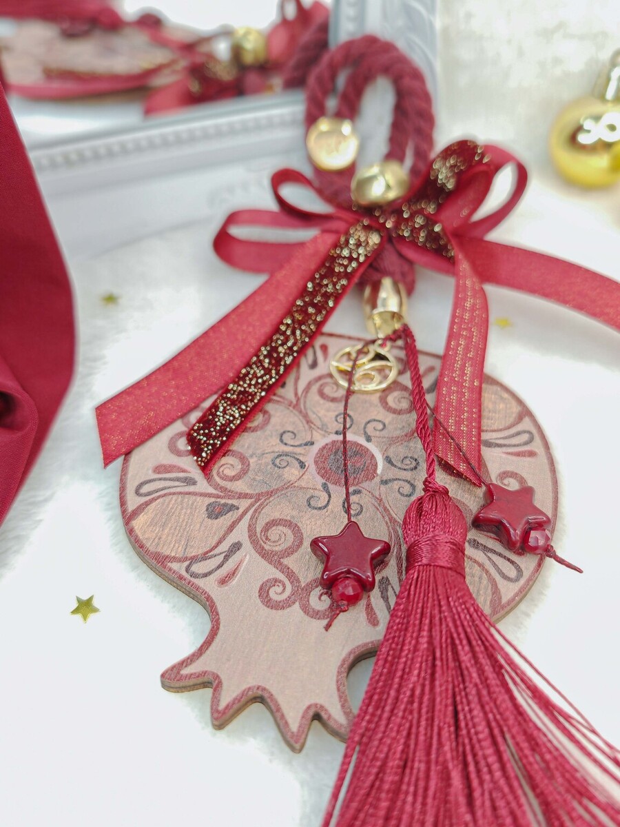 Μεγάλο ξύλινο ρόδι με κορδέλες και κορδόνια σε αποχρώσεις μπορντώ και χρυσό, κλασσικό και εντυπωσιακό.