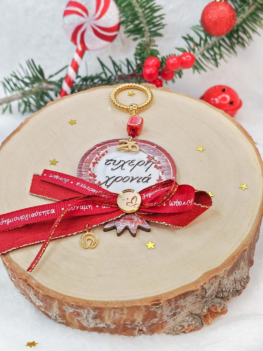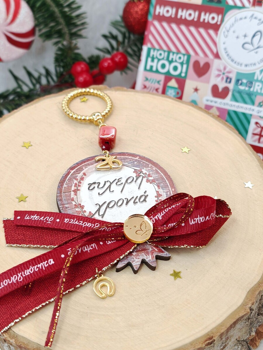 Ξύλινο ρόδι με ευχές για μια τυχερή χρονιά, με μεταλλικά στοιχεία και κεραμική χάντρα.