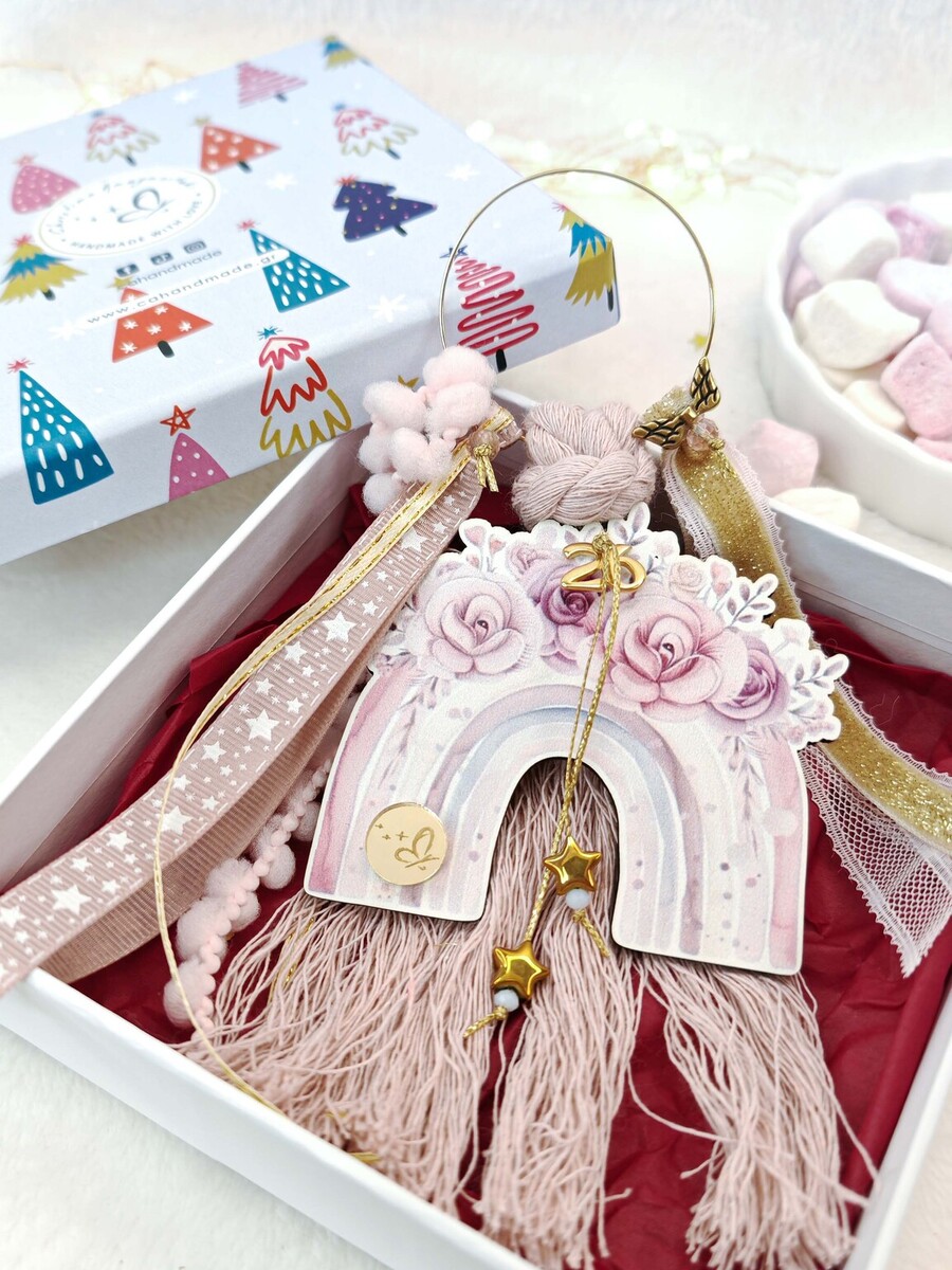 Ένα boho και ρομαντικό γούρι με ξύλινο ουράνιο τόξο σε αποχρώσεις ροζ, χρυσό και σάπιο μήλο.