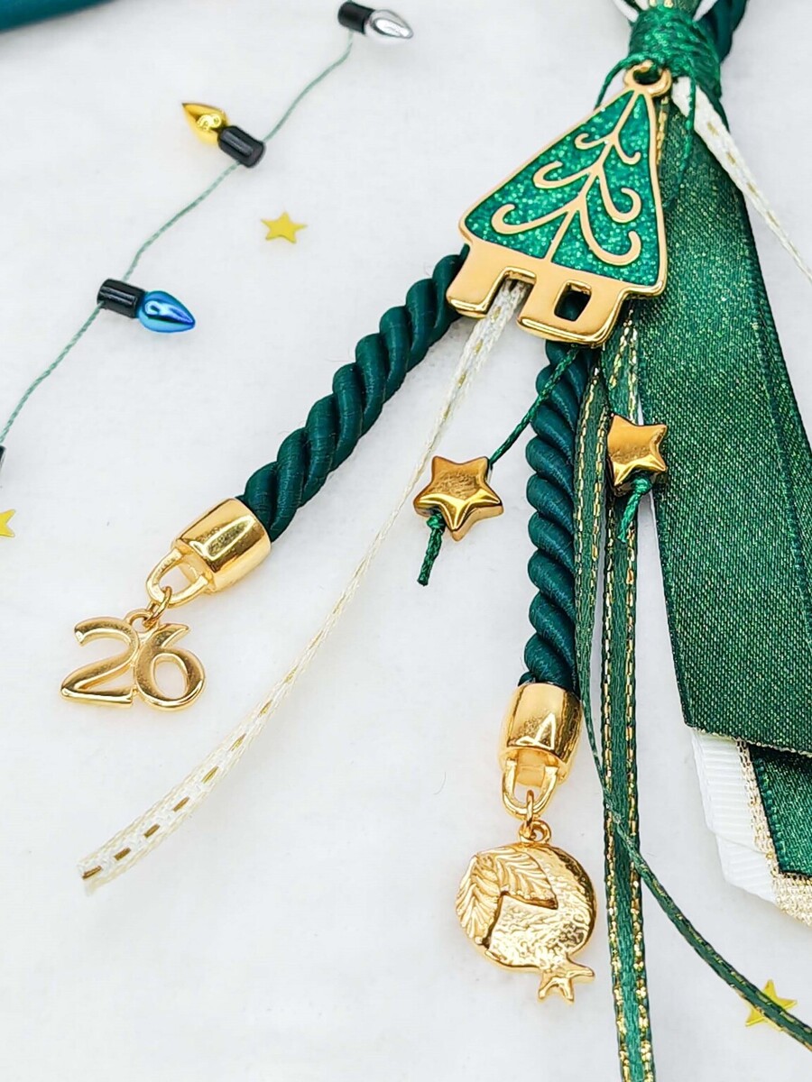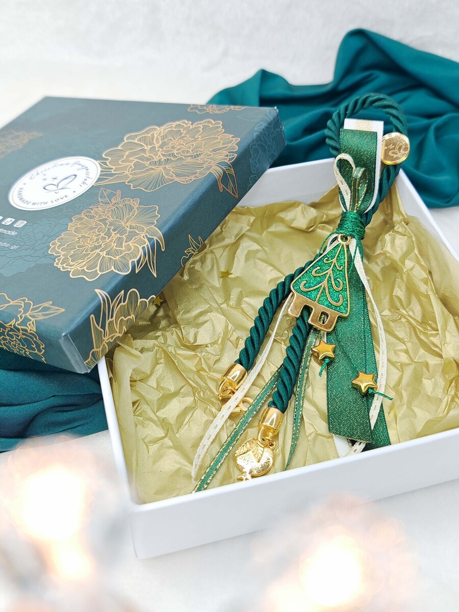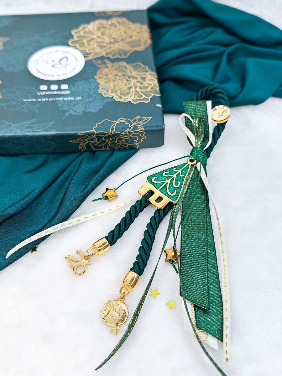 Είναι γιορτινό και όμορφο, σε κυπαρισσί αποχρώσεις με χρυσά στοιχεία, με σπίτι δέντρο με σμάλτο γκλίτερ πράσινο.