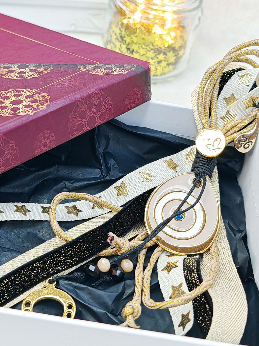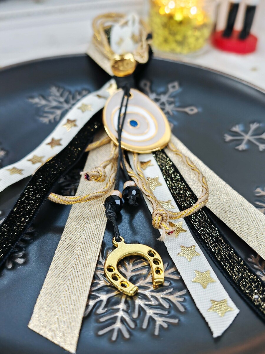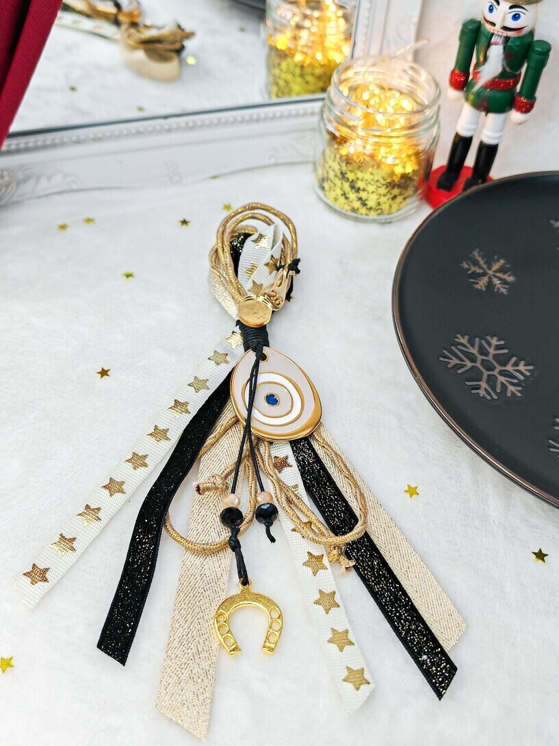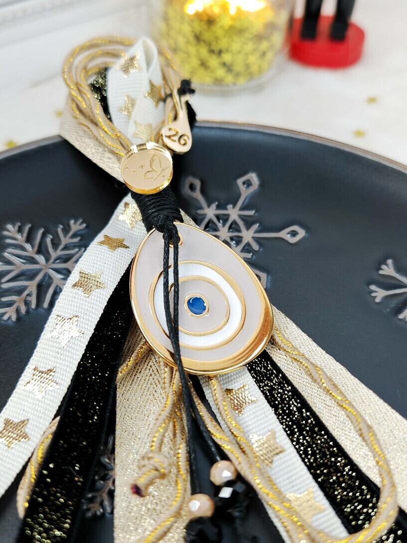 Μοντέρνο γούρι με μάτι από ορείχαλκο με σμάλτο μπεζ και λευκό, πέταλο και κρύσταλλα και κορδέλες.
