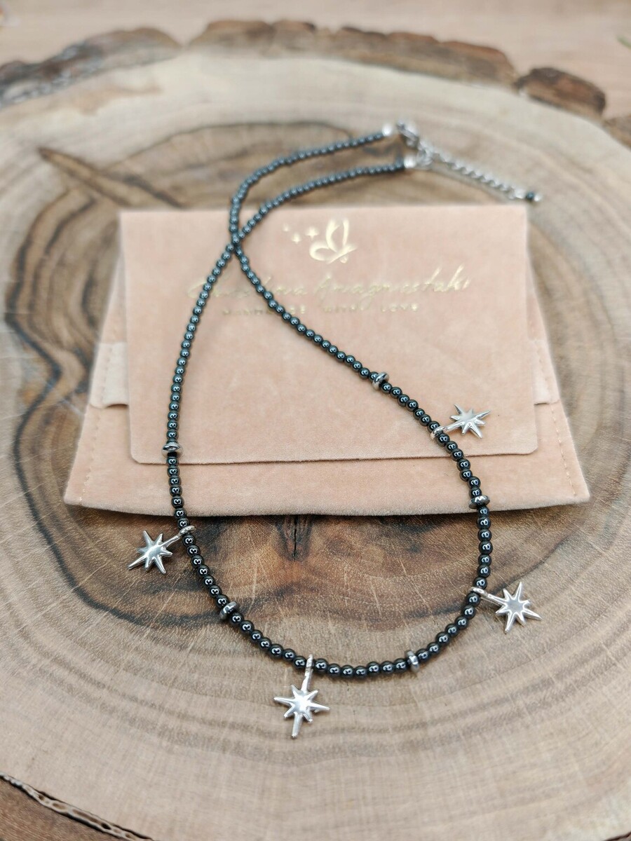 Κολιέ με Αιματίτες 40 εκατοστά συν επέκταση έξτρα ατσάλινη, με αστέρια από ορείχαλκο